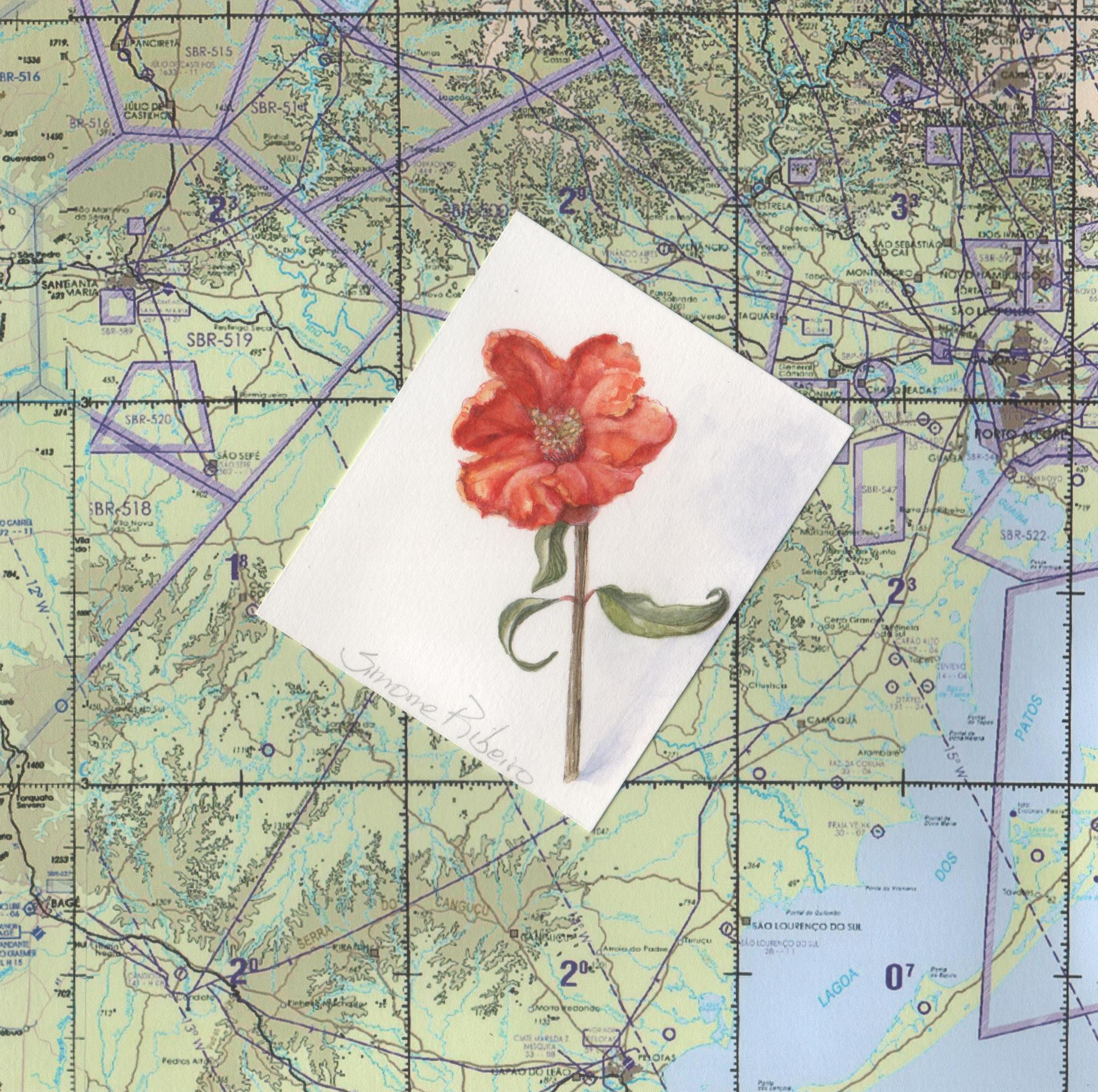 Pensei assim: Eu sou representada pela romã em três fases da minha vida: colocada sobre uma carta com receitas, sobre um mapa aéreo e sobre um desenho. A carta é da minha mãe que, com sua linda letra, mandava receitas para mim pelo correio. O mapa aéreo mostra um significativo trecho entre Porto Alegre e Bagé (que representa o Marcus). O desenho da terceira fase é do Rafa, com uns 7 anos de idade, onde eu estou em forma de fruto! Assim!